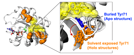 In a cooperative project with Mirati Therapeutics, Target X predicts the known cryptic pockets in K-Ras oncoprotein (yellow -inhibitor, orange - pocket residues